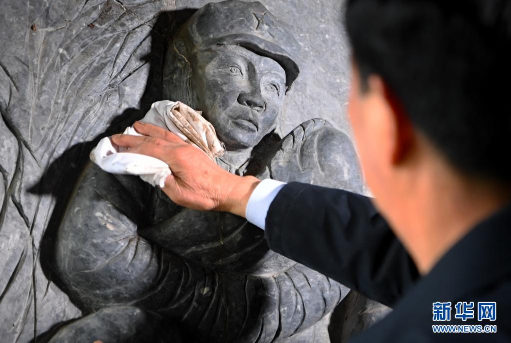 4月2日,曾祥有在金刚台红军洞里擦拭雕塑。