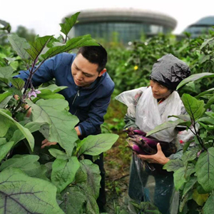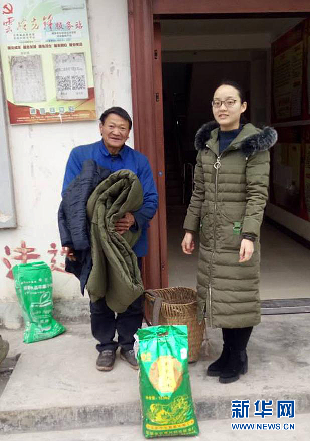 王秋婷(右)到贫困户家里走访(资料照片)。新华社发