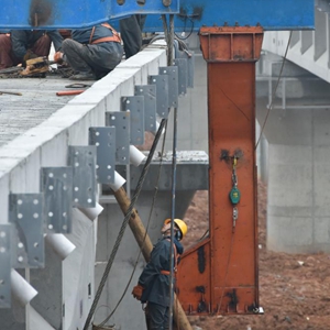 4月5日,工人在常益长铁路6标动走左线特大桥T梁架设现场施工。