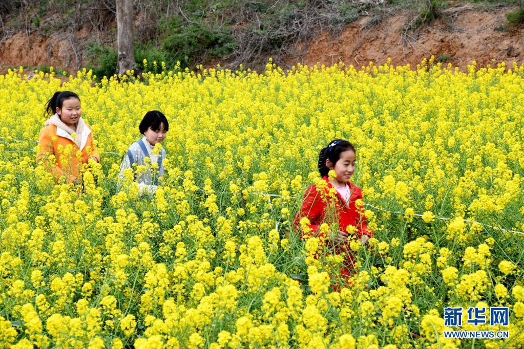 4月5日,孩子们在河南省济源市坡头镇狄沟村田间赏花。