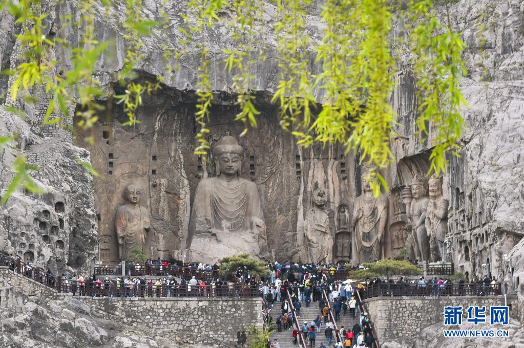 4月4日,游客在位于河南洛阳的龙门石窟景区内参观游览。