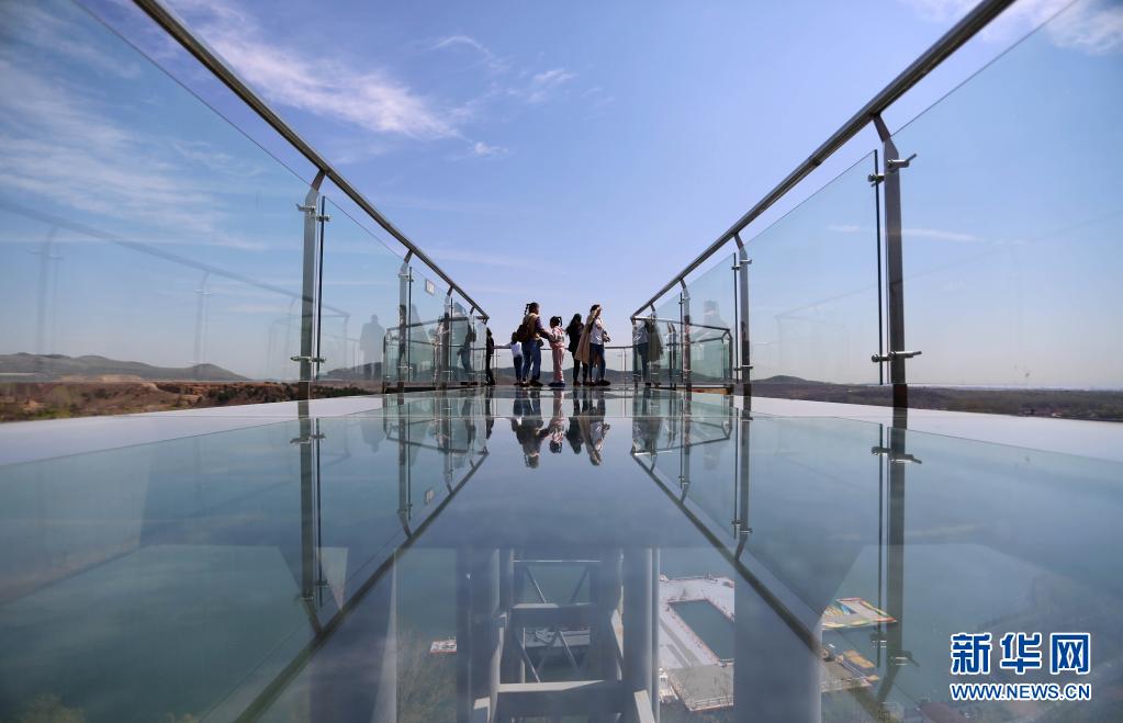 4月5日,游客在山东省临沂市沂南县红石寨景区内体验高空玻璃栈道。