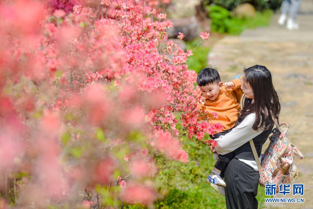 4月5日,一对母子在浙江省湖州市长兴县和平镇城山沟景区内观赏杜鹃花。