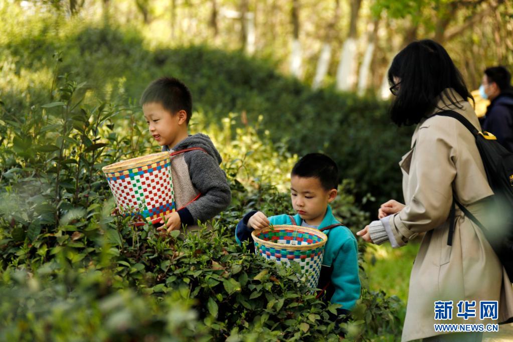 4月5日,家长陪伴孩子在南京科技馆茶园体验采茶。