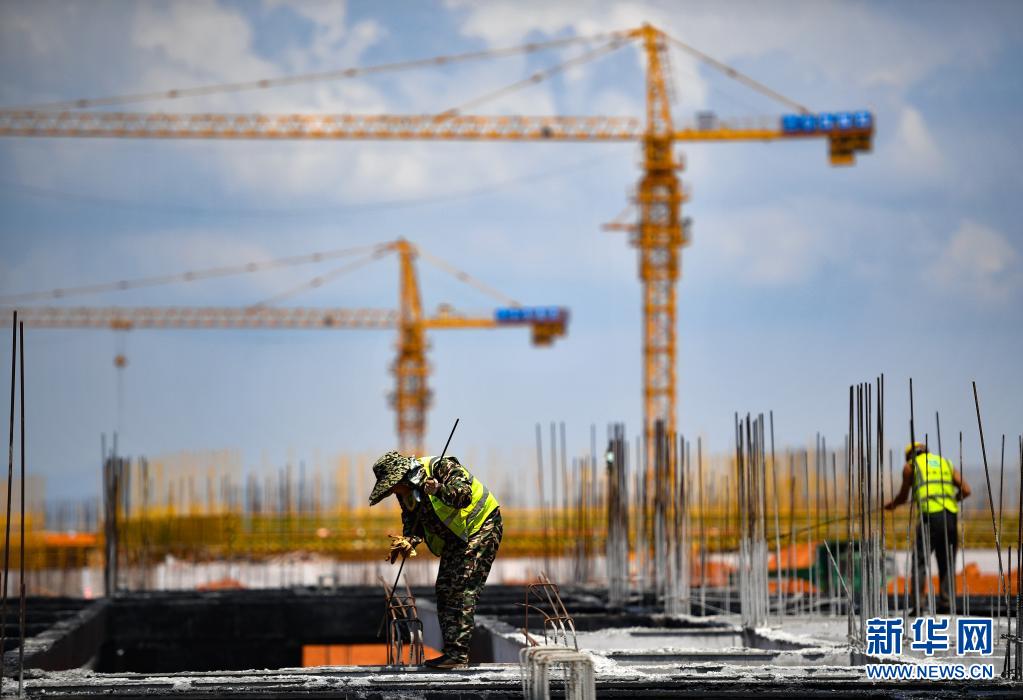 4月5日,工人在海南自由贸易港陵水黎安国际教育创新试验区一期项目工地施工。