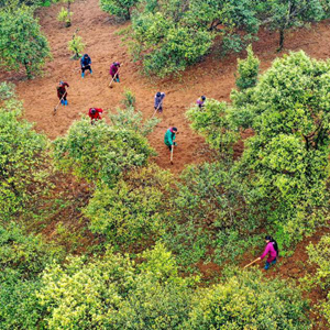 4月6日,农民在贵州省铜仁市玉屏侗族自治县朱家场镇茅坡村管护油茶树(无人机照片)。