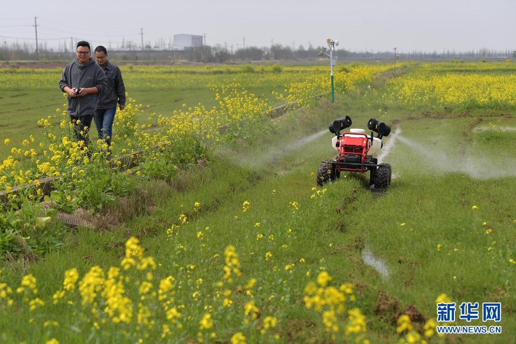 在江西省南昌县蒋巷镇大田农社万亩农场,无人植保机在对油菜进行植保作业(3月12日摄)。