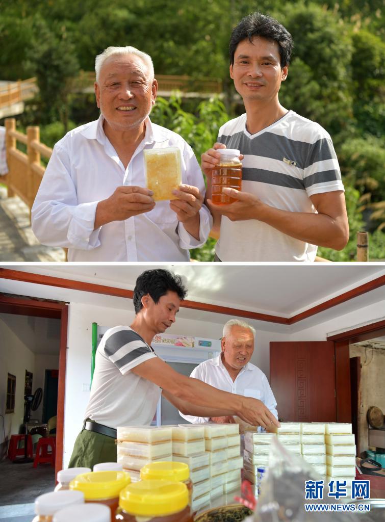 这是一张拼版照片,上图为:井冈山神山村村民彭水生和儿子彭小华展示自家出品的蜂蜜(2020年7月15日摄);下图为:神山村村民彭水生和儿子彭小华打包顾客订购的蜂蜜(2020年7月15日摄)。新华社记者 彭昭之 摄