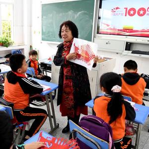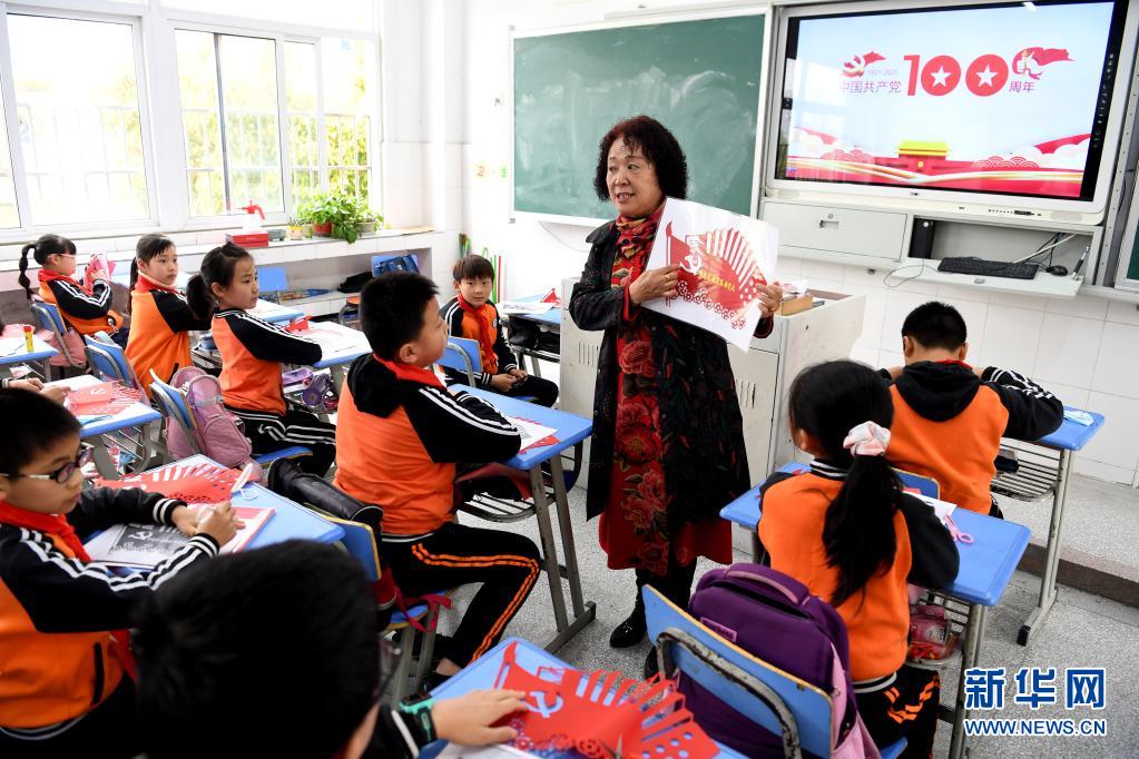 4月7日,合肥市常青街道淝南社区的剪纸爱好者教孩子们创作“建党百年”主题剪纸。