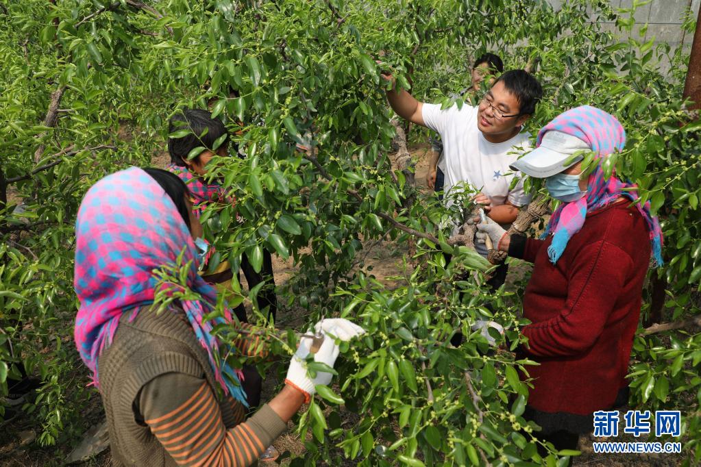4月7日,农业技术人员给沧县绿然农业合作社社员讲解冬枣树管理技术。连日来,在河北省沧州市沧县的冬枣大棚里,枣农们忙着对冬枣树进行管理,确保错季冬枣上市品质和产量。近年来,沧县加强农业产业结构调整,促进农民增收致富,助力乡村振兴。新华社记者 骆学峰 摄