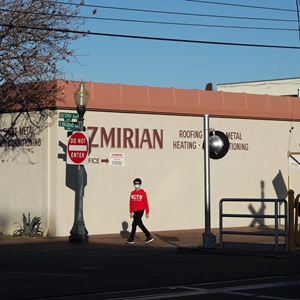 4月6日,一名行人拿着外卖走在美国加利福尼亚州北部小城圣马特奥的火车站前。