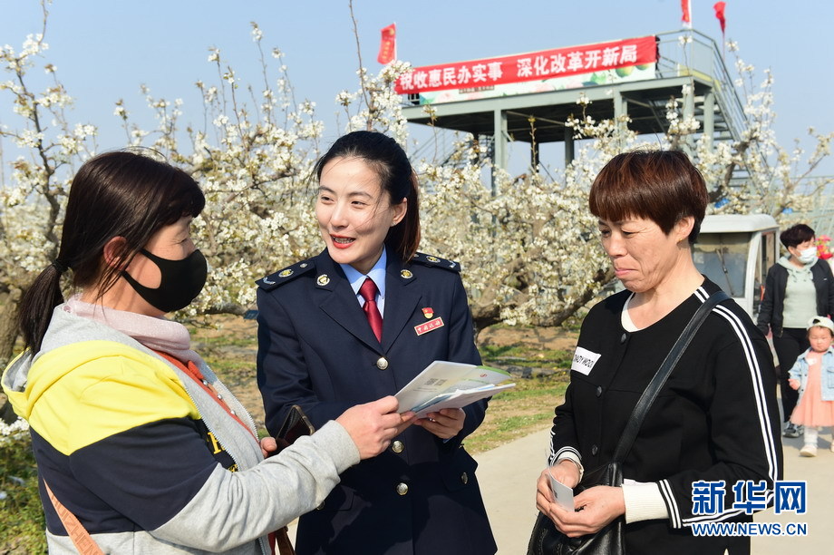 4月7日,国家税局总局河北泊头市税务局工作人员到亚丰梨园,讲解减税降费政策。新华网发(傅新春 摄)