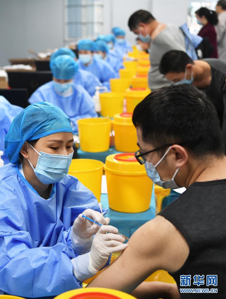 4月8日,在重庆江北观音桥商圈的“方舱接种点”,医护人员为市民接种新冠疫苗。