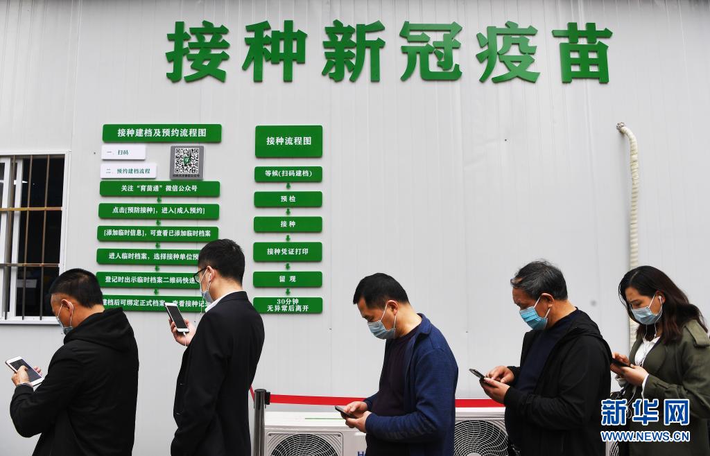 4月8日,市民在重庆江北观音桥商圈的“方舱接种点”排队等待接种新冠疫苗。