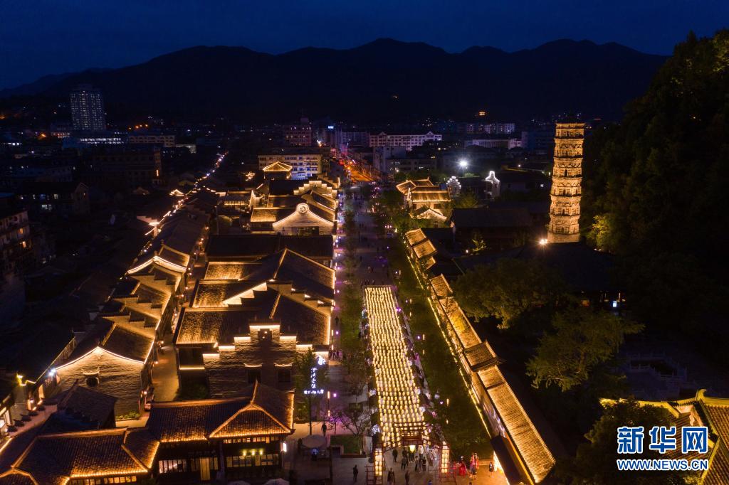 空中俯瞰台州临海的台州府城文化旅游区夜景。这里囊括了江南长城、紫阳古街、东湖夜月、巾山塔群等知名景点,旅游资源丰富、层次多样(4月7日摄,无人机照片)。