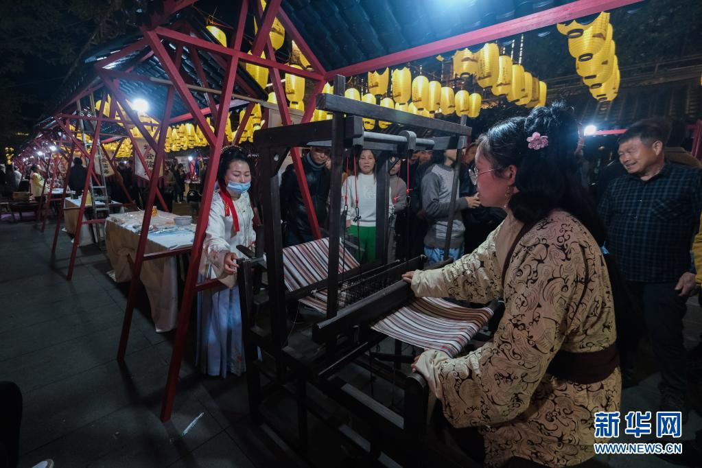 4月7日,临海的台州府城文化旅游区的工作人员身着传统服饰操作传统织布机,这也是紫阳街夜游项目之一。
