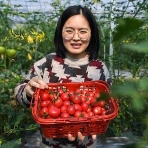 4月8日,游客在织里镇一处精品农业园的生态种植大棚内采摘春季首批成熟的樱桃番茄。
