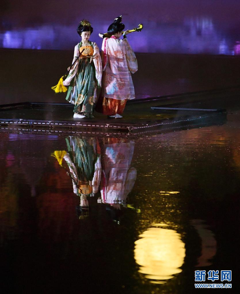 当日,大型水上实景演出《曹州吟》在山东省菏泽市举行首场演出。演出以园林景区内实景为舞台,运用激光特效、水幕等科技,融汇舞蹈、戏曲、武术、杂技等元素,展现菏泽的历史文化、民俗风情、非遗传承等内容。新华社记者 李贺 摄