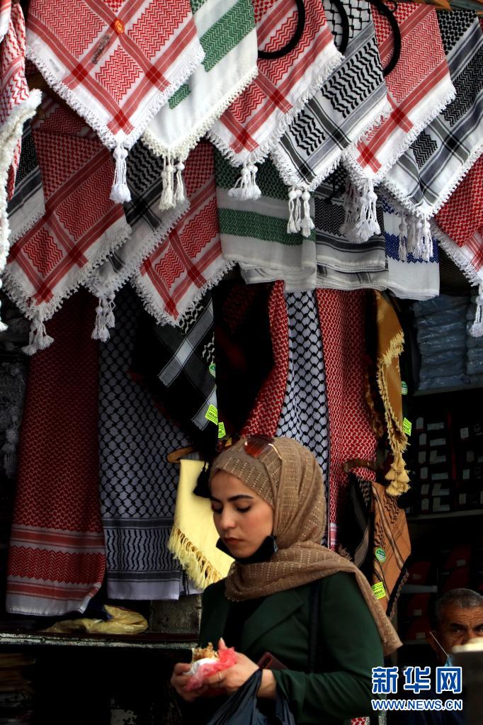 4月8日,一名女子走过约旦首都安曼一家售卖传统头巾的店铺。