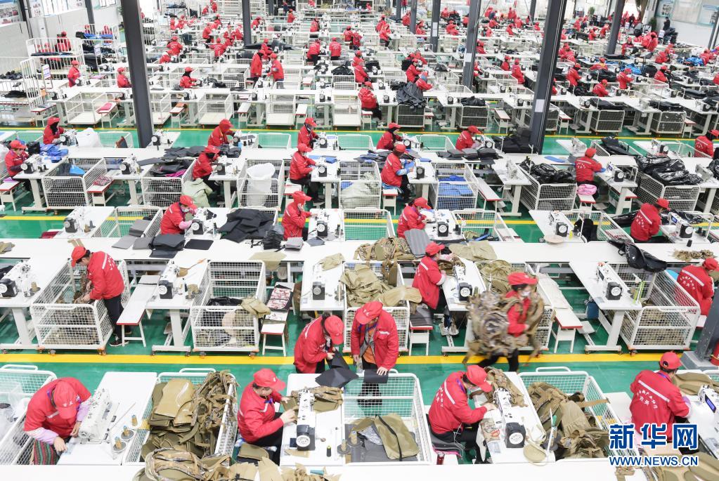 在甘肃省临夏回族自治州和政县一扶贫车间里,工人在包袋生产线上作业(2020年10月17日摄)。和政县依托东西部协作,引进鞋业、包袋、食用菌种植等企业,助力产业发展带动增收。