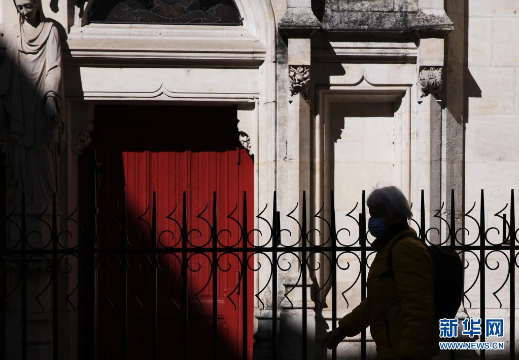 4月8日,一名女子走过位于法国巴黎南部的蒙塔日市中心的教堂。