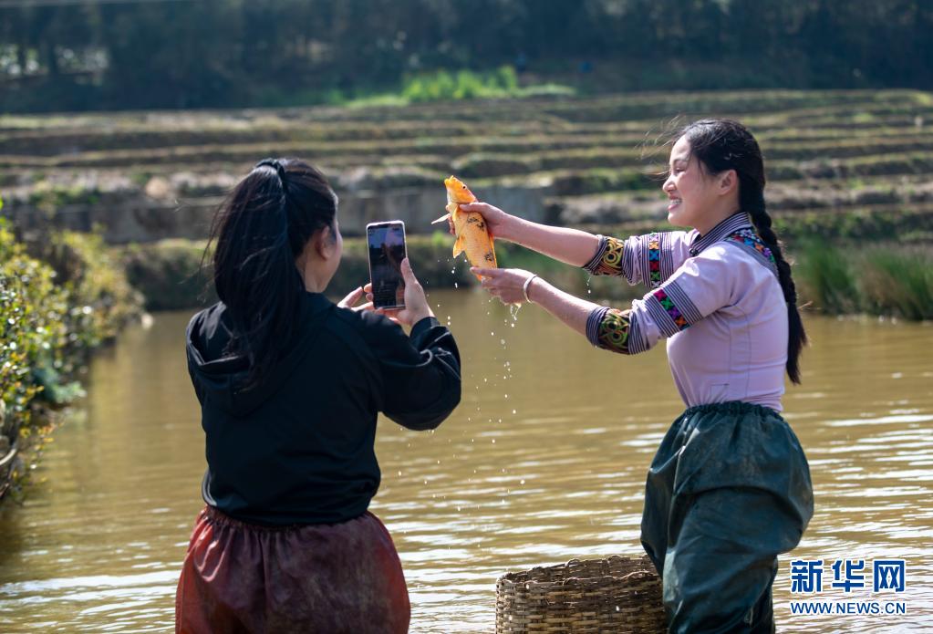 哈尼族姑娘丁继楠(右)和直播团队成员在新街镇大鱼塘村梯田直播抓鱼(2月25日摄)。新华社记者 陈欣波 摄
