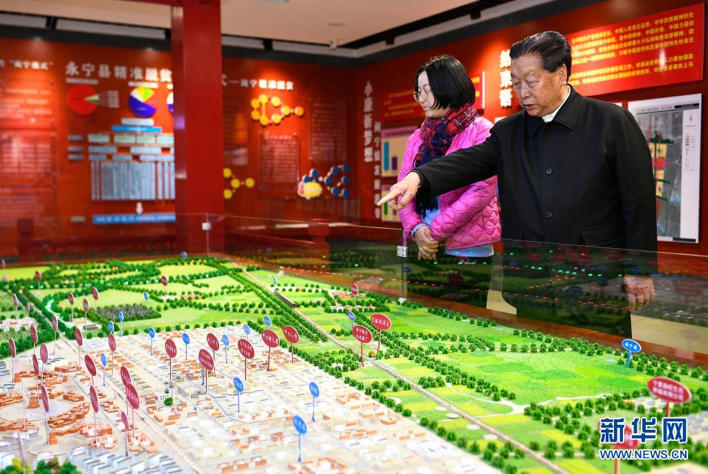 3月29日,林占熺(右)在宁夏银川市永宁县闽宁镇镇史馆观看闽宁镇新区沙盘图,追忆扶贫往事。