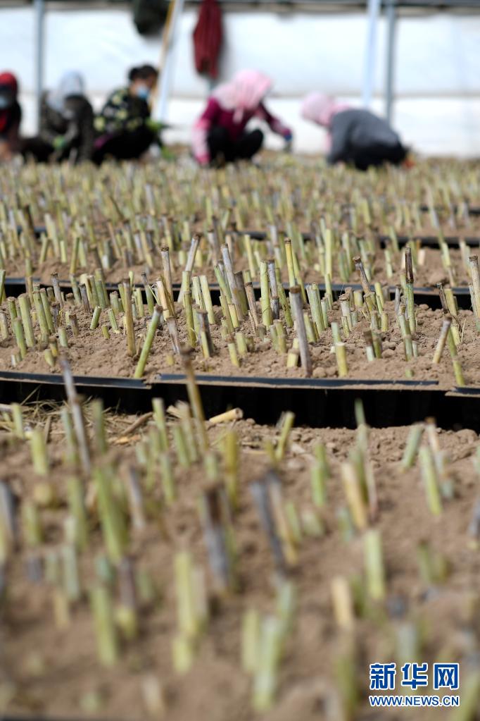 宁夏银川市永宁县闽宁镇园艺村大棚里栽植的菌草(3月29日摄)。