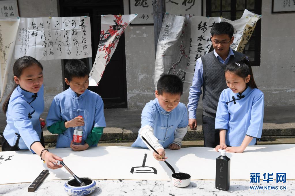 近日,浙江省诸暨市斯民小学的百年梓树鲜花盛放,学校在梓树下举办一年一度的书法节,邀请书画名家前来和学生交流。斯民小学是一所有百年历史的名校,以书法教育为特色。