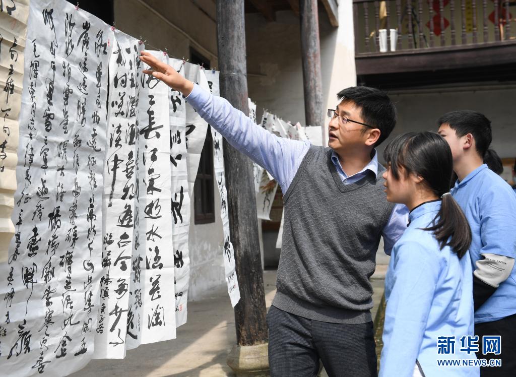 4月9日,斯民小学的老师(左)向学生介绍书画家作品。