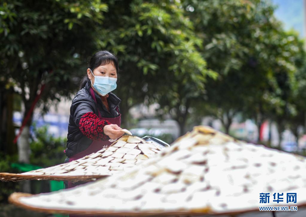 4月9日,在铜仁市江口县双江街道,豆干制作工人往烘架上摆放豆干。
