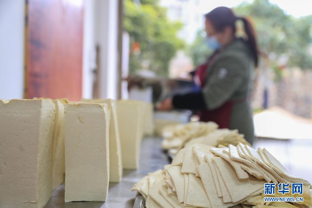 4月9日,在铜仁市江口县双江街道,豆干制作工人在切豆干。