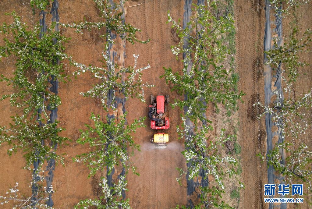 4月9日,在河北省赞皇县土门乡花果山生态农业园区,农民驾驶多功能田间作业机对樱桃树进行田间管护作业(无人机照片)。新华社记者 金皓原 摄