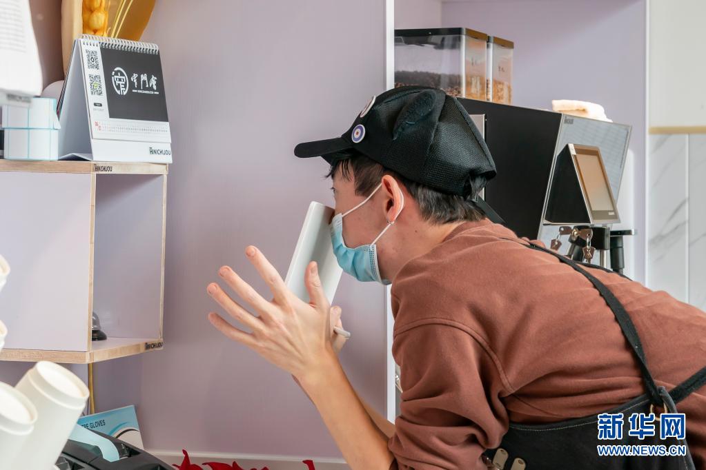 4月8日,阿肯在窗口通过手写板与店员交流。