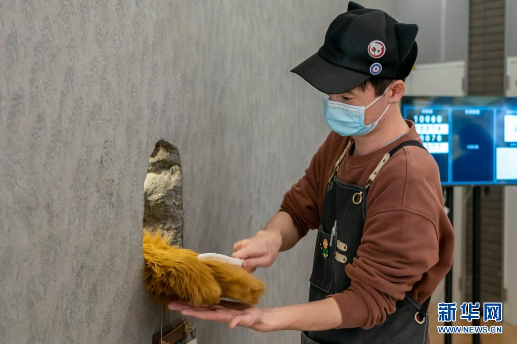 4月8日,阿肯来到“熊爪”咖啡店洞口为“熊爪”梳毛。
