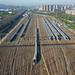 4月9日,一列复兴号动车组列车驶出南京动车段南京南动车运用所(无人机照片)。