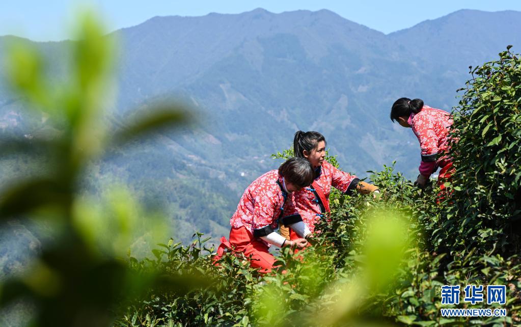 4月9日,茶农在安徽歙县溪头镇鲫鱼背高山茶园采茶。新华社记者 韩旭 摄