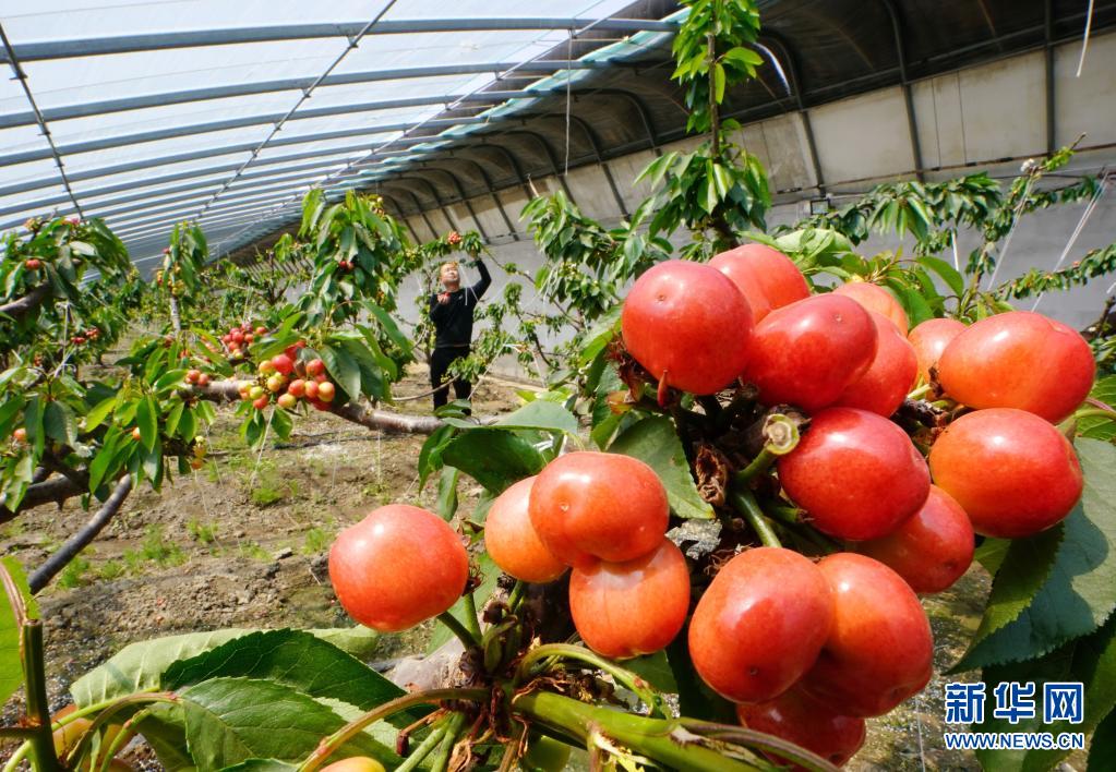 4月9日,唐山市曹妃甸区中国盐生植物园的工人在大棚内管护即将成熟的樱桃。新华社记者 杨世尧 摄