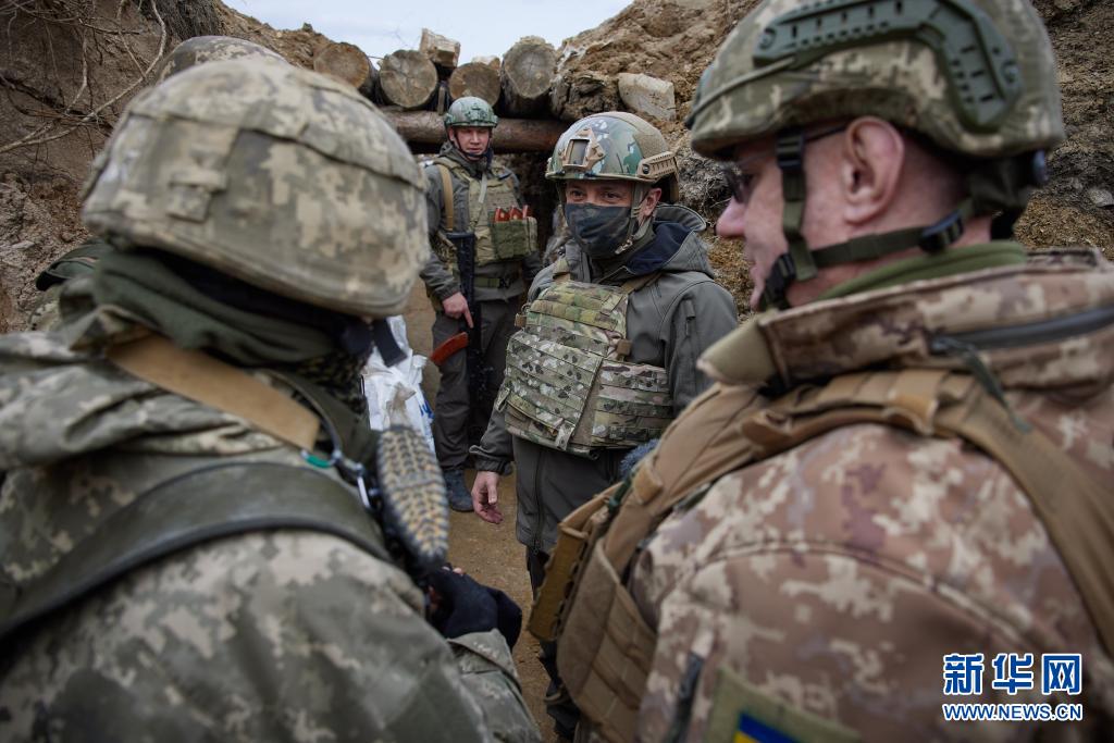 这张乌克兰总统办公室提供的照片显示,4月8日,乌克兰总统泽连斯基(中)在顿巴斯地区乌政府军阵地视察。新华社发(乌克兰总统办公室供图)