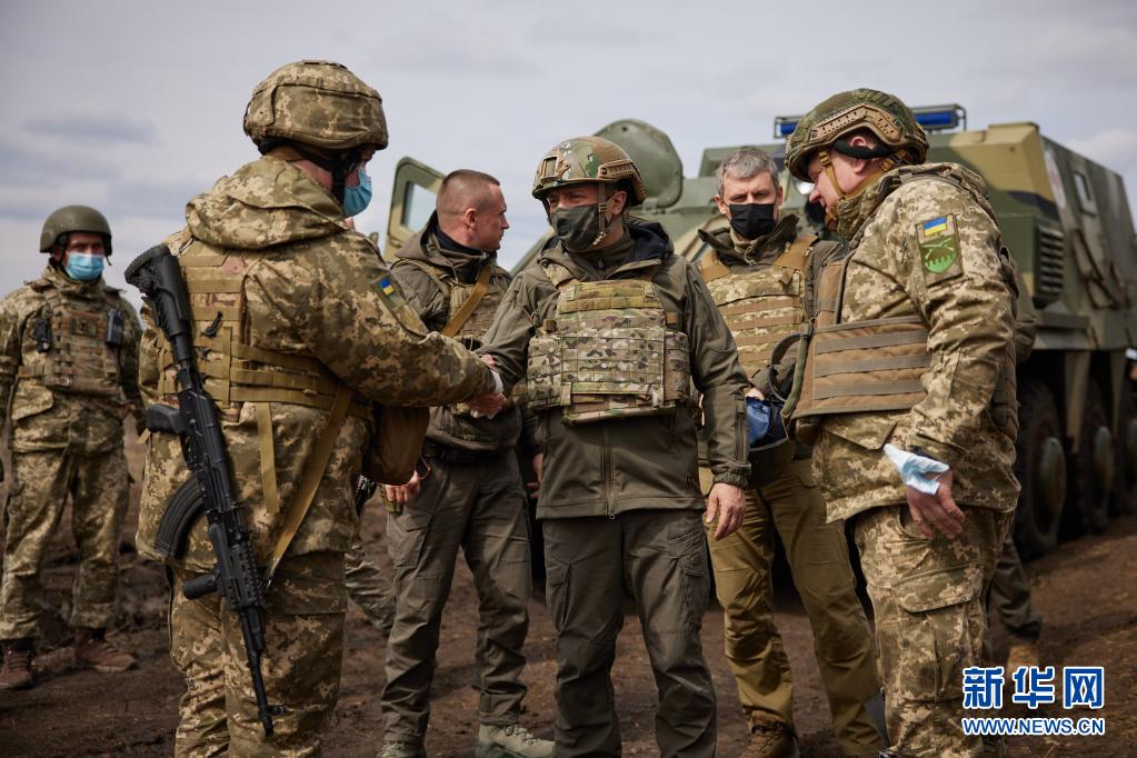 这张乌克兰总统办公室提供的照片显示,4月8日,乌克兰总统泽连斯基(中)在顿巴斯地区乌政府军阵地视察。新华社发(乌克兰总统办公室供图)