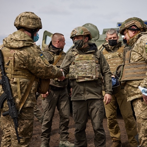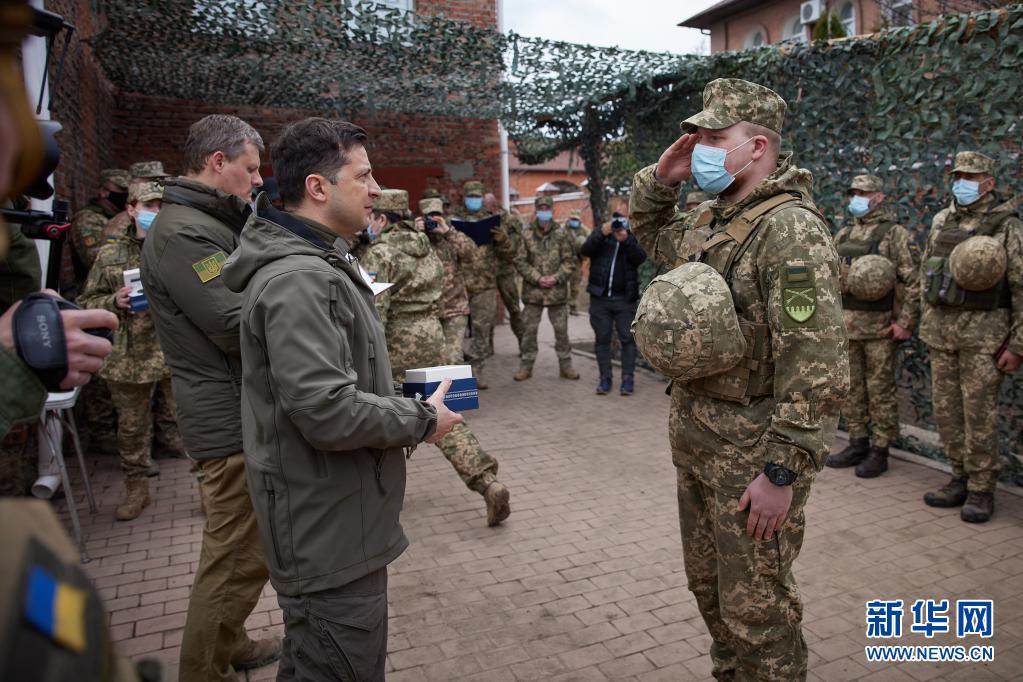 这张乌克兰总统办公室提供的照片显示,4月8日,乌克兰总统泽连斯基(前左)慰问驻守在顿巴斯地区的乌政府军士兵。新华社发(乌克兰总统办公室供图)