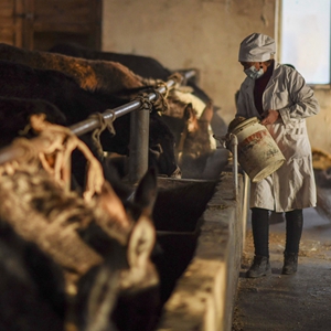 在新疆和田皮山县阔什塔格镇加依纳古特村,布威萨热·阿卜杜杰力将毛驴拴好,准备挤奶(2月4日摄)。