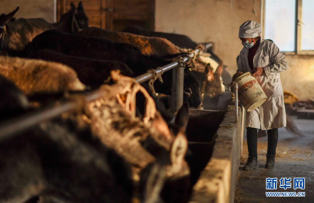 在新疆和田皮山县阔什塔格镇加依纳古特村,布威萨热·阿卜杜杰力在驴圈里忙碌(2月4日摄)。新华社记者 赵戈 摄