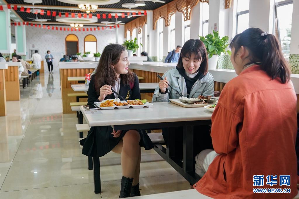 热萨莱提(左)在学校食堂内就餐(4月7日摄)。新华社记者 丁汀 摄