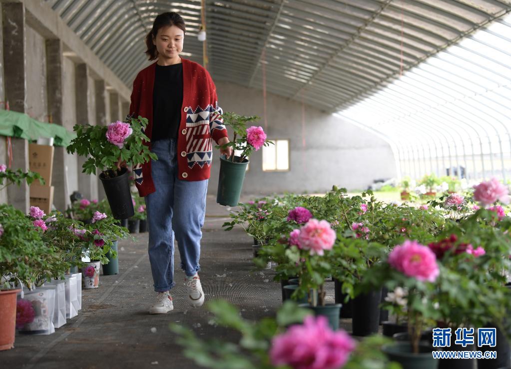 4月9日,工作人员在菏泽谷雨牡丹生物科技有限公司的花卉培育大棚内挑选盆栽牡丹对外销售。