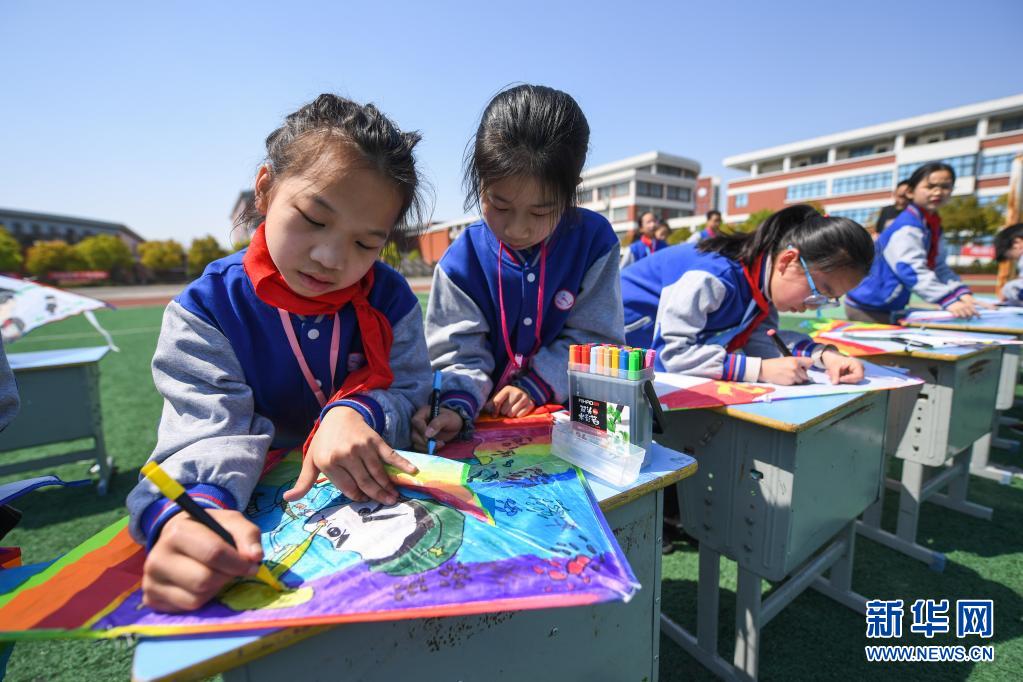 4月9日,学生们在主题活动上绘制风筝。新华社记者 徐昱 摄
