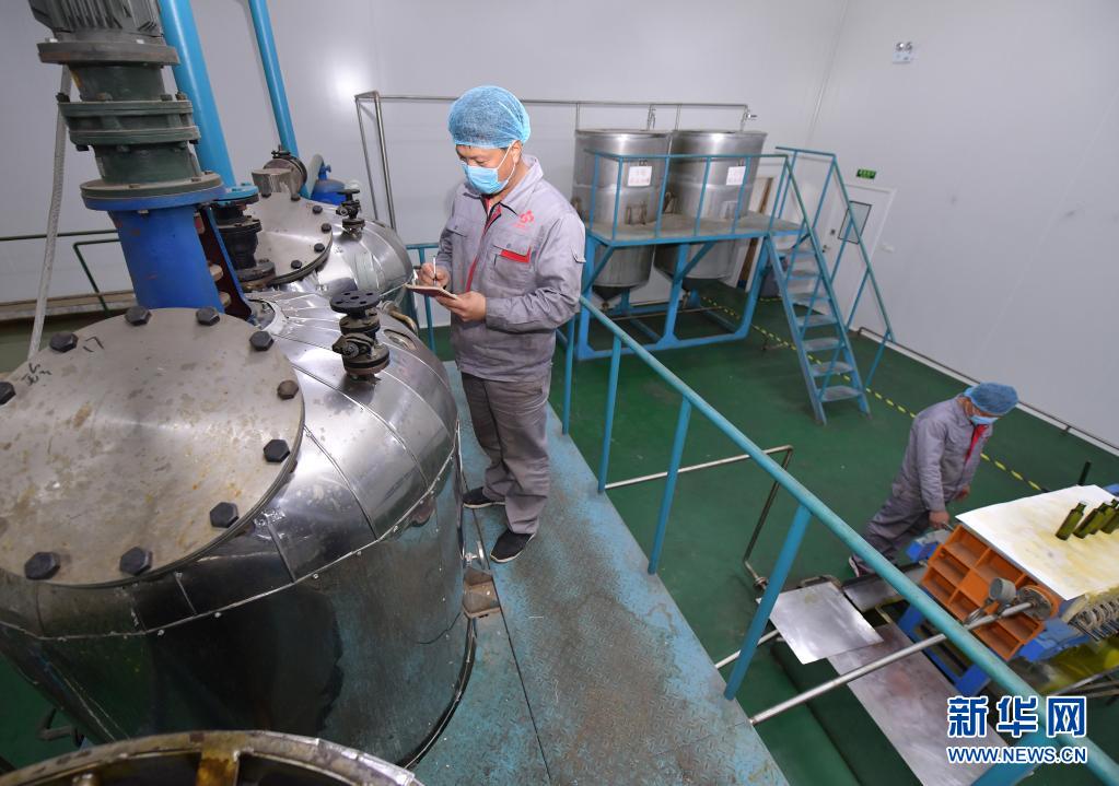 4月9日,工作人员在菏泽谷雨牡丹生物科技有限公司的生产车间内提取牡丹花籽油。新华社记者 李贺 摄
