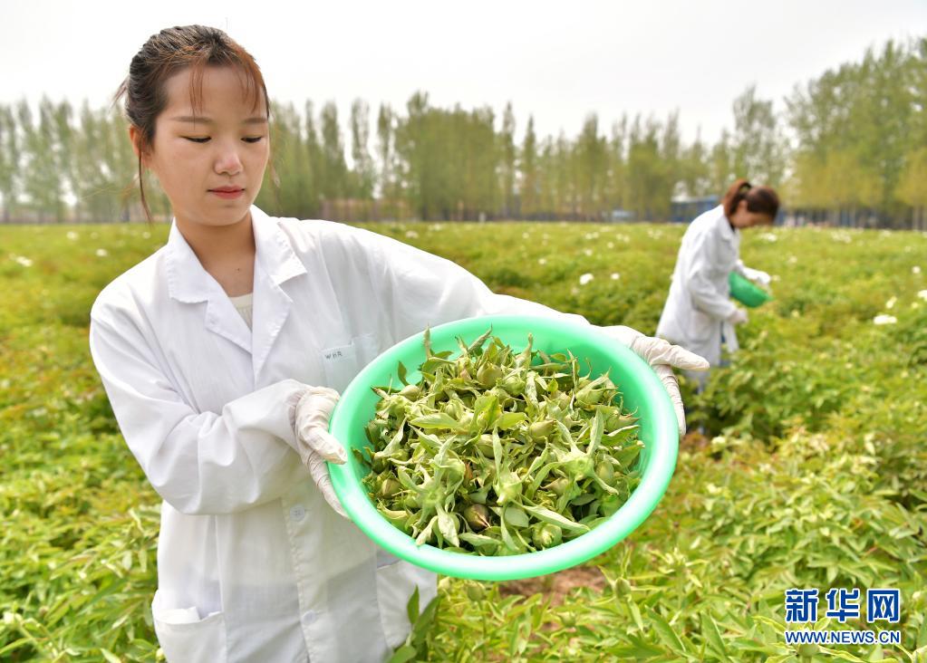 4月9日,工作人员在菏泽市牡丹区黄堽镇刘集村的种植园采摘用于加工的牡丹花苞。新华社记者 李贺 摄