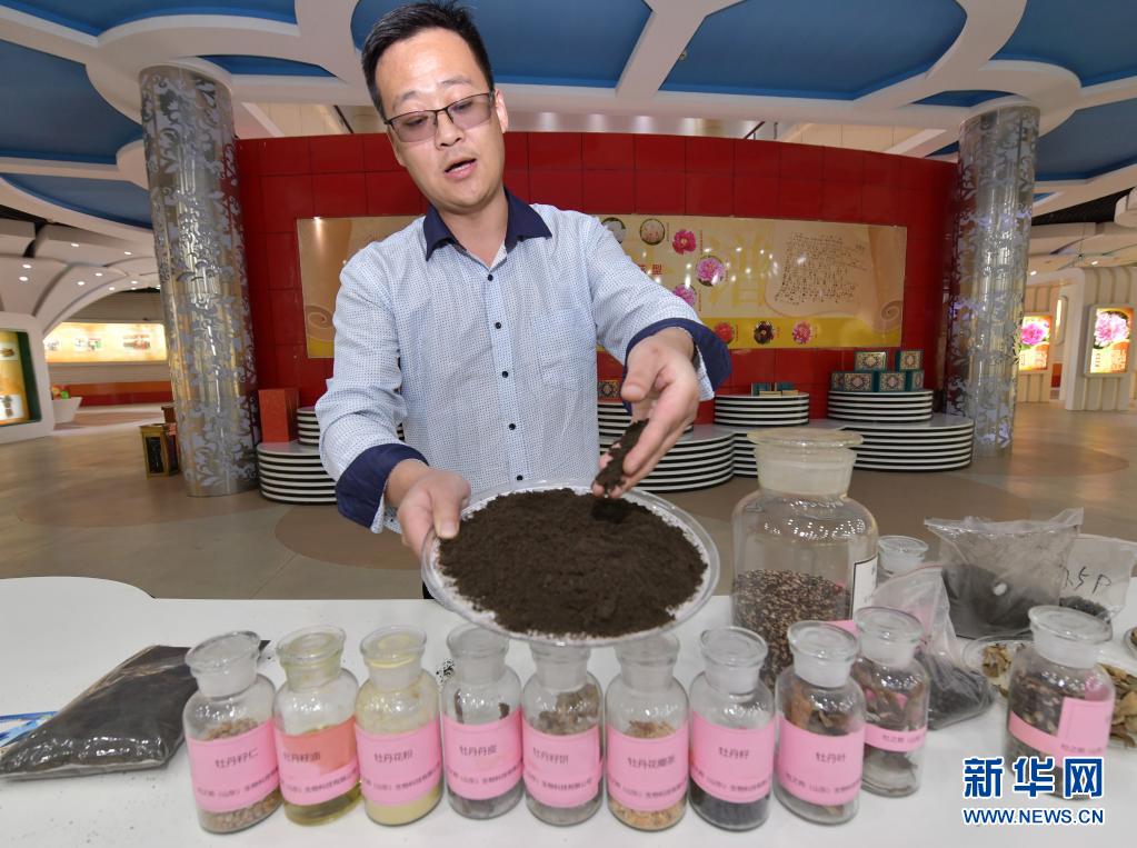 4月9日,佳禾生物科技有限公司工作人员在菏泽国花牡丹园展厅内展示利用牡丹废料生产的生物饲料添加剂产品。新华社记者 李贺 摄