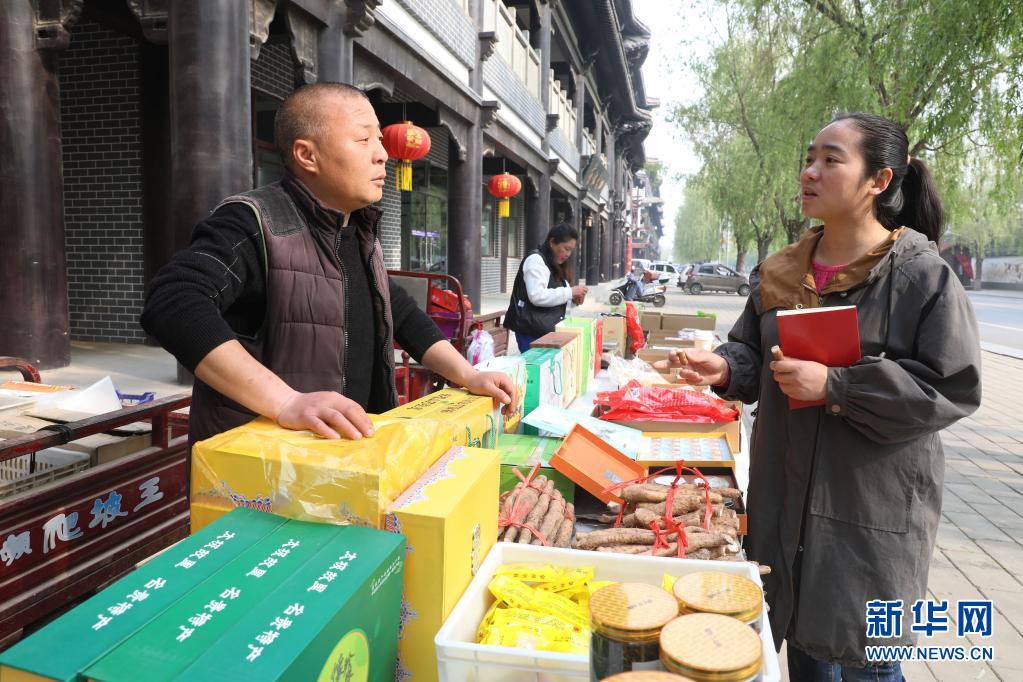 4月9日,在焦作市温县赵堡镇陈家沟村,“乡村振兴指导员”贾媛媛(右)在陈家沟景区向一户摊贩了解农产品销售情况。今年二月,河南省焦作市温县从机关单位挑选一批优秀青年干部,进驻全县262个行政村担任“乡村振兴指导员”,让优秀青年干部在农村施展才智,拓宽发展思路,助力乡村振兴。新华社发(徐宏星 摄)